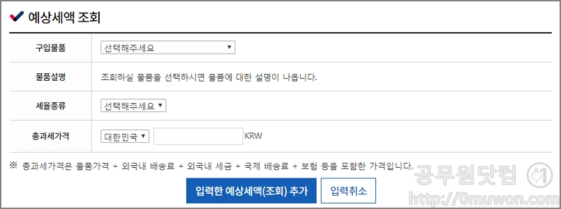▼ 세율종류를 선택합니다. 세율의 종류는 위 내용을 참고하세요. 총과세가격을 입력 후 입력한 예상세액 조회 추가 버튼을 클릭하면 됩니다. 바로 예상세액이 조회가 간단하게 됩니다.
