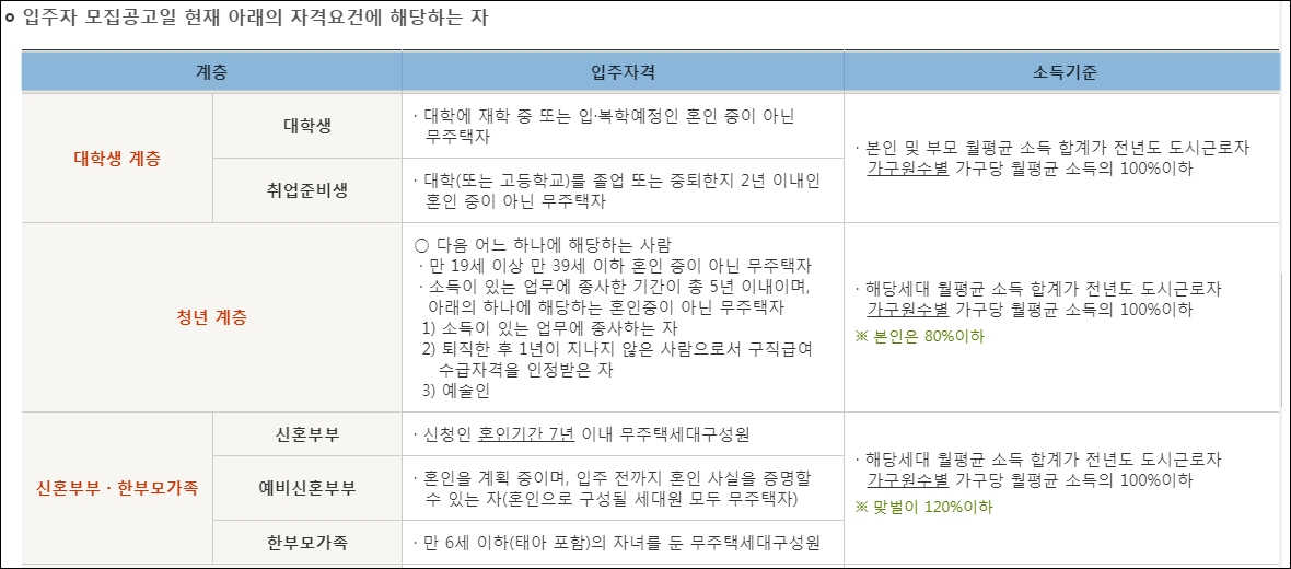 입주자격 및 소득기준은 자주 변경될 수 있습니다. 꼭 입주자모집 공고문을 확인해 보시기 바랍니다.