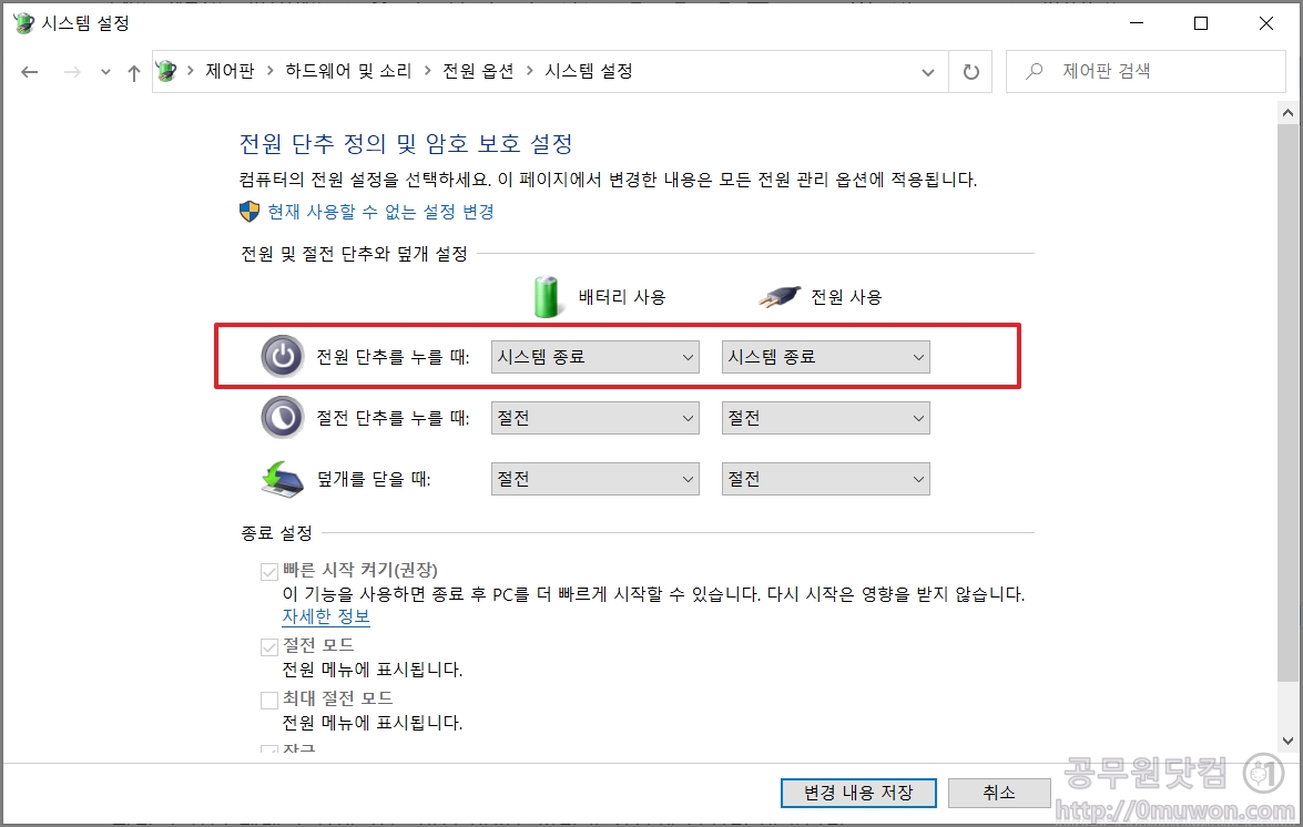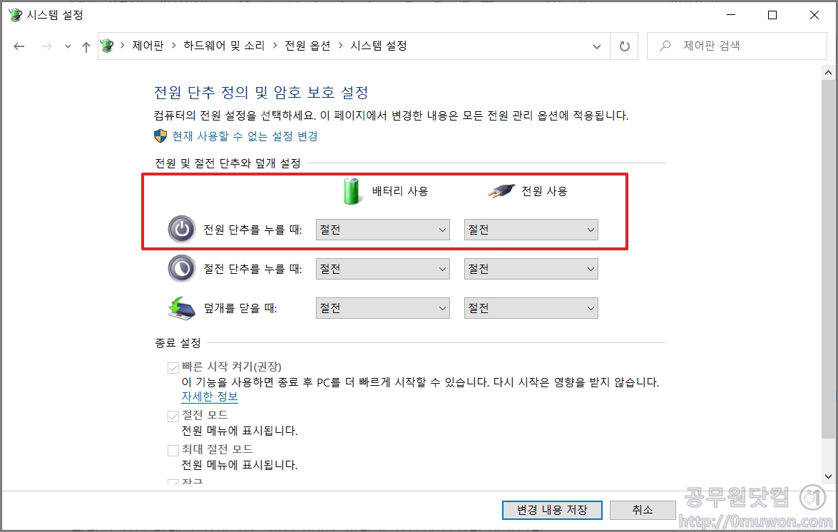 3. 전원 단추를 누를 때 배터리 사용과 전원 사용이 절전으로 되어 있습니다. 이 부분을 변경하면 됩니다.