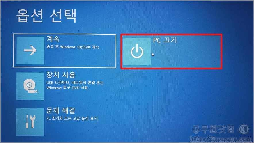 4. 옵션 선택 화면이 나옵니다. 여기에서 'PC 끄기'를 클릭하면 됩니다. 그러면 절전모드 종료가 아닌 완전히 꺼지게 됩니다.