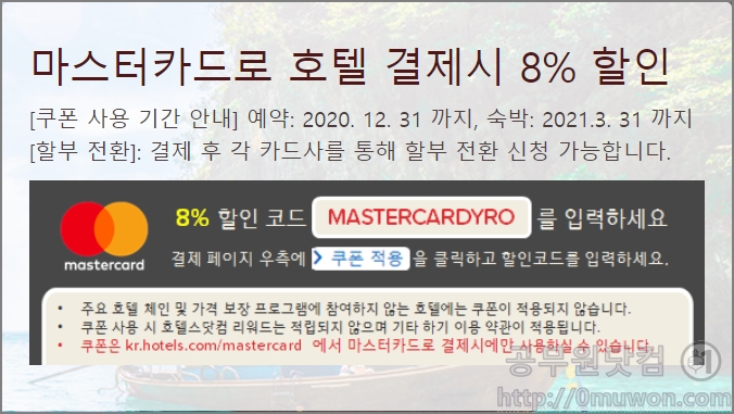 쿠폰사용기간은 2020년 12월 31일까지입니다. 숙박은 2021년 3월 31일까지 입니다. 결제 후 카드사를 통해 할부 전환 신청이 가능합니다