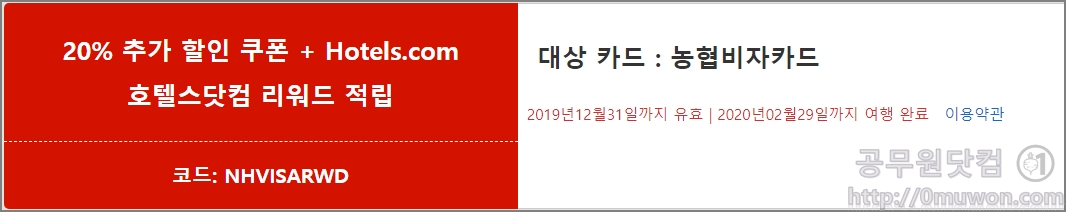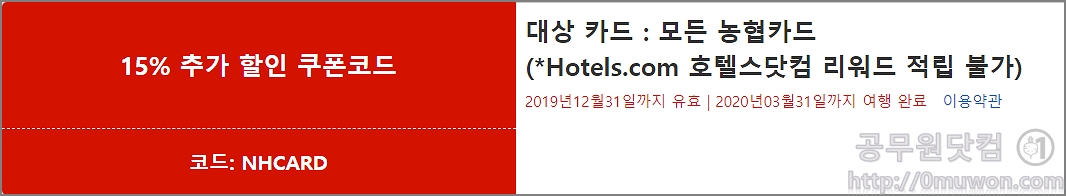 2020년 12월 31일까지 유효한 쿠폰입니다. 그리고 2020년 12월 31일까지 체크아웃을 하여야 합니다. 특정신용카드를 사용하지 않아도 됩니다. 호텔스닷컴에서 진행하는 코드입니다.