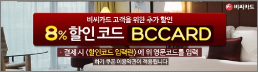 비씨카드를 가지고 있는 분들은 8% 할인이 가능합니다. 2019년 12월 31일까지 사용이 가능하며, 2020년 3월 31일까지 숙박이 가능합니다.