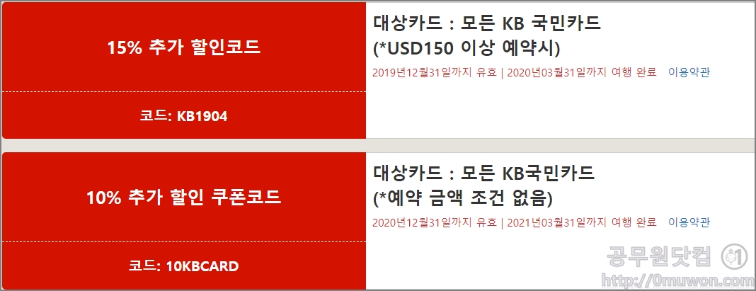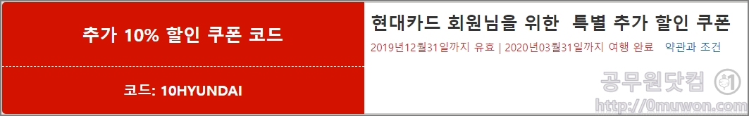 현대카드는 10%할인이 됩니다. 2019년 12월 31일까지 유효하며, 2020년 3월 31일까지 여행 완료하여야 합니다.