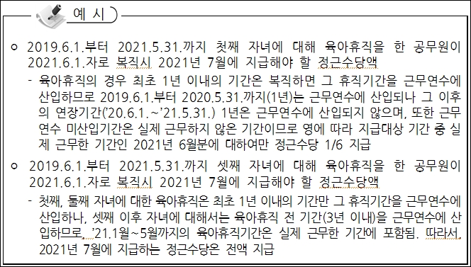 3. 1월 1일부터 6월 30일까지 육아휴직 후 7월 1일 복직한 경우입니다. 이 경우는 정근수당이 지급되지 않습니다. 7월 1일 복직을 하여 공무원 신분이기는 하나, 1월 1일부터 6월 30일까지 근무를 하지 않아 봉급이 지급되지 않은 사람이기 때문입니다.