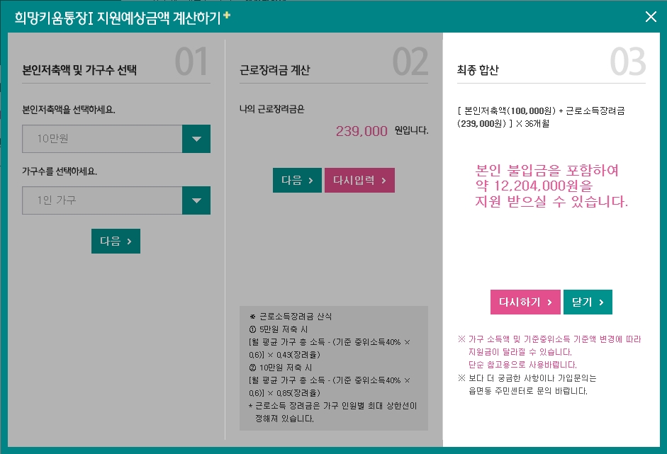 단, 3년간 매월 성실히 저축을 하였으나, 조건을 충족하지 못해 탈수급에 실패한 가구에 대해 누적 근로소득장려금의 5%를 지급하며 다시 재도전 할 수 있는 기회를 1회 한정하여 제공합니다. 실패하더라도 1번 더 도전이 가능합니다.