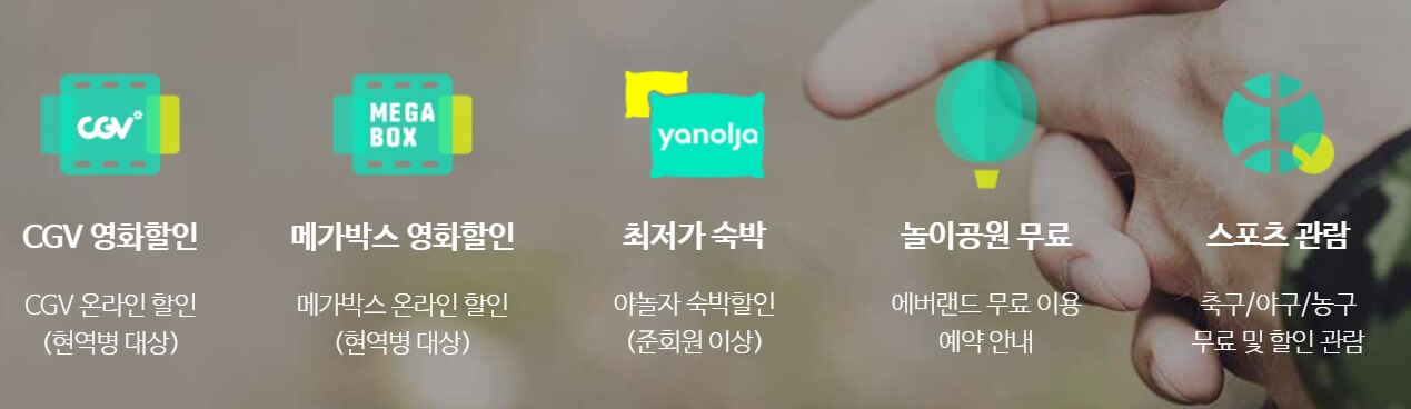이렇게 나라를 지키는데 애쓰고 있는 군인 장병들을 위해 휴가기간 동안 즐길 수 있는 혜택을 제공하고 있습니다. 그리고 예비군 훈련을 받은 분들에게도 영화할인 등 다양한 문화할인을 주고 있습니다.