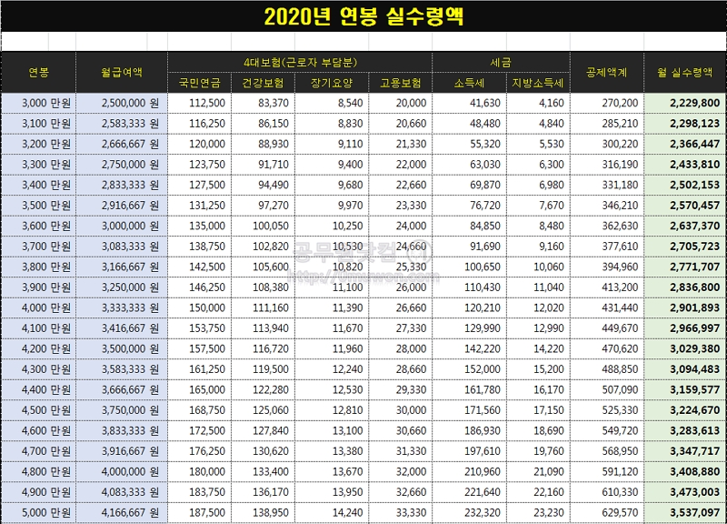 연봉 3000만원의 경우, 월 급여액은 2,500,000원 정도되며, 세금 등을 공제하고 나면 실 수령액은 2,229,800원 정도됩니다. 연봉 4000만원의 월 실수령액은 2,901,893원입니다.