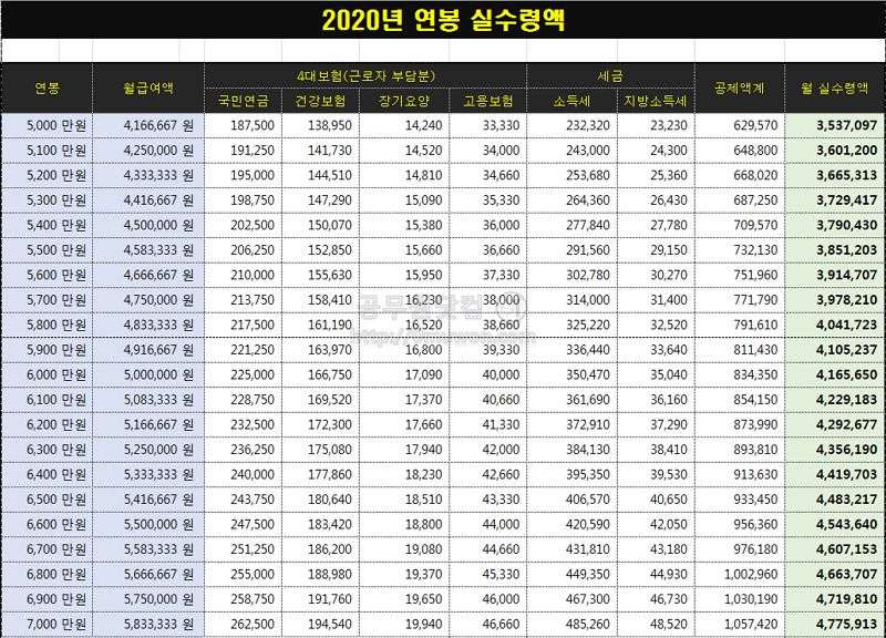 연봉 5000만원의 경우 월급여액은 4,166,667원정도 됩니다. 세금 및 4대보험을 공제하고 나면 3,537,097원 정도로 계산이 됩니다. 연봉 6천만원은 월급여액으 5백만원입니다. 실제 수령액은 4,165,650원 정도가 됩니다.