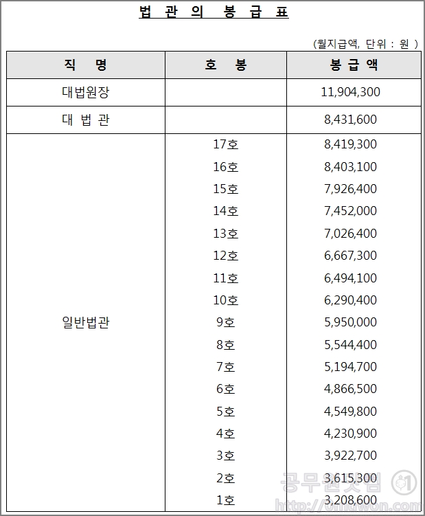 아래는 2019년 법관의 봉급표입니다.
