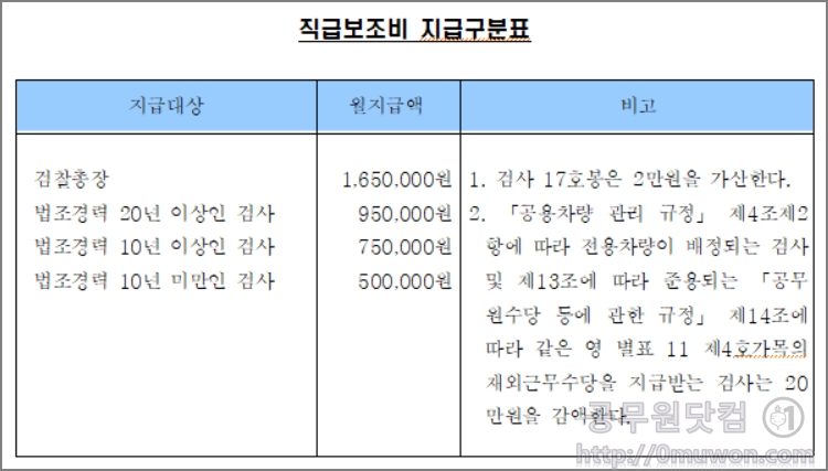 검사에게도 직급보조비를 지급합니다. 예산의 범위 내에서 보수지급일에 같이 지급을 합니다. 검찰총장의 직급보조비는 1,650,000원입니다. 법조경력 20년 이상인 검사는 950,000원, 법조경력 10년 이상인 검사는 750,000원, 법조경력 10년 미만인 검사는 500,000원입니다. 여기에 검사 17호봉은 2만원을 가산합니다.