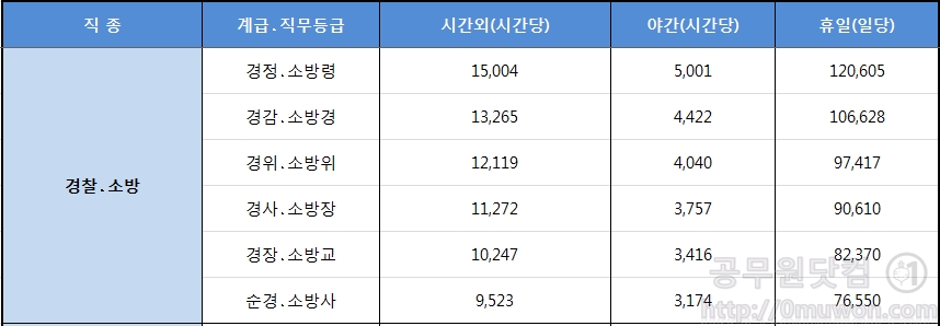 소방공무원은 소방령, 소방경, 소방위, 소방장, 소방교, 소방사의 초과근무수당도 확인을 해보세요. 순경의 경우 9,523원, 경장의 경우 10,247원, 경사는 11,272원, 경위는 12,119원입니다.