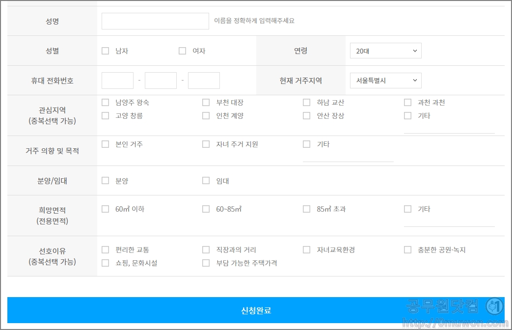 성명, 성별, 연령, 휴대 전화번호, 현재 거주지역, 관심지역, 희망 면적 등을 입력 후 '신청완료' 버튼을 클릭합니다.
