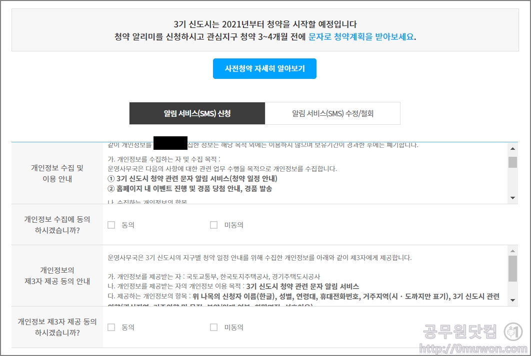 먼저 3기 신도시 홈페이지에서 '청약일정 알리미' 메뉴를 클릭합니다. 알리미 서비스 신청에 개인 정보 제공 동의를 합니다.
