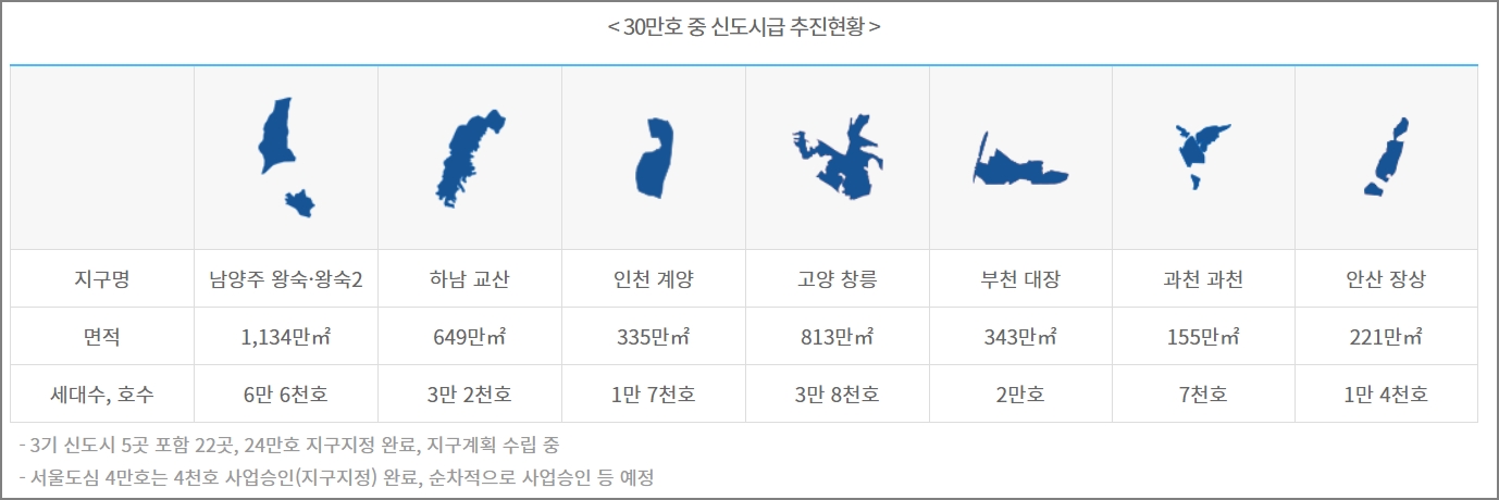 3기 신도시는 수도권에 30만호를 공급하기 위해 계획한 대규모 택지개발지구입니다. 수도권 30만호 중 신도시 5곳을 모두 포함하여 24만호가 지구지정 완료되었가 되었습니다.