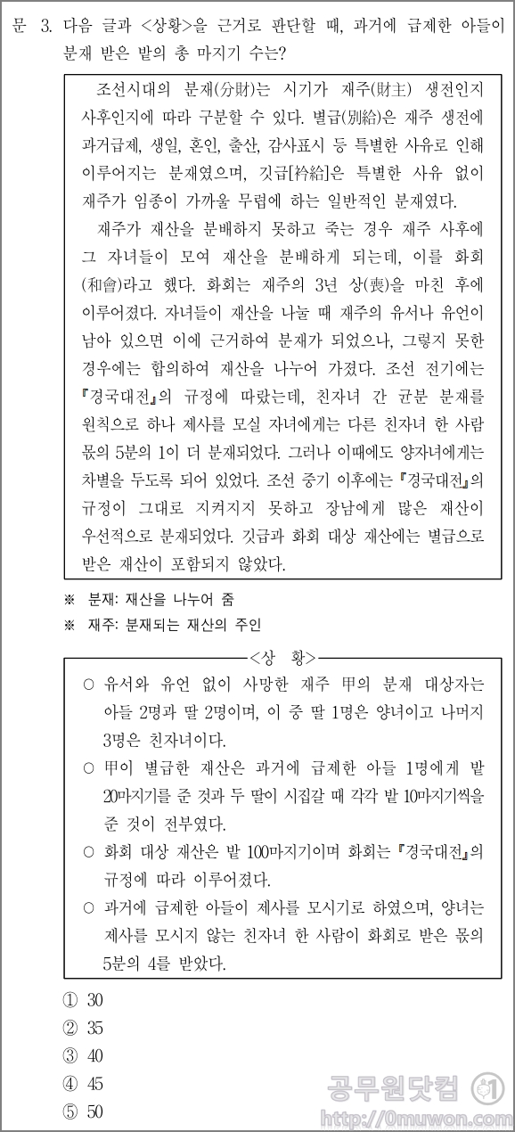 급제한 아들 1명 20마지기, 두 딸은 시집갈 때 10마지기씩 이미 분재가 되었습니다. 화회대상 마지기수는 100 입니다. 급제한 아들이 분재 받은 총 마지기 수는 20마지기와 화회대상분을 더하면 됩니다.