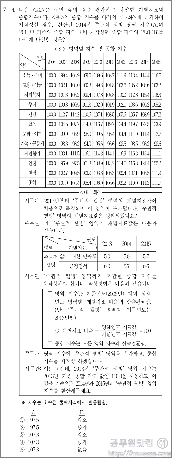 국민 삶의 질을 평가하는 다양한 개별지표와 종합지수가 나타낸 표를 보고 푸는 문제입니다.