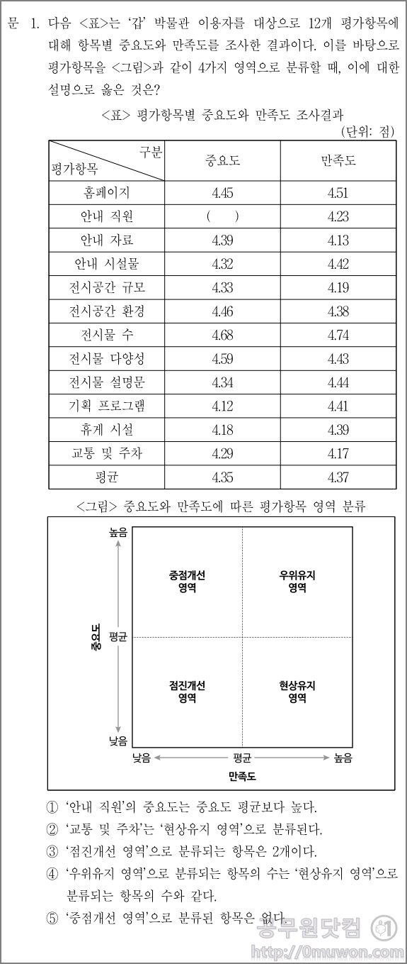 평가항목별 중요도와 만족도 조사결과, 중요도와 만족도에 따른 평가항목 영역 분류 그림을 보고 옳은 것을 찾는 문제 유형입니다.