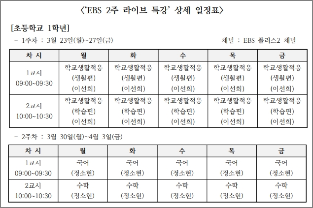 초등학교 1학년의 경우는 인터넷 라이브 대신 EBS 플러스 2 채널에서 학교생활적응 및 교과 기초내용을 방송하고 있습니다. 1주차인 23일부터 27일까지는 학교생활적응 방송입니다.