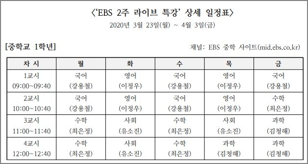 중학교 1학년부터 3학년은 EBS 중학 사이트에 9시부터 1시가지 특강을 합니다. 국어 강용철 선생님, 영어 이정우 선생님, 수학 최은정 선생님, 사회 유소진 선생님, 과학 김청해 선생님이 수업합니다. <중학 사이트 바로가기>