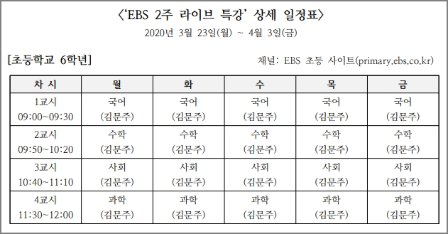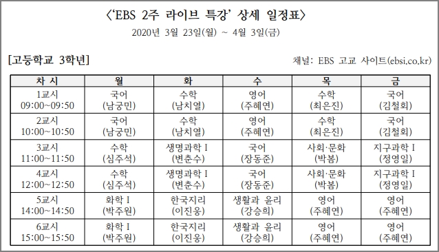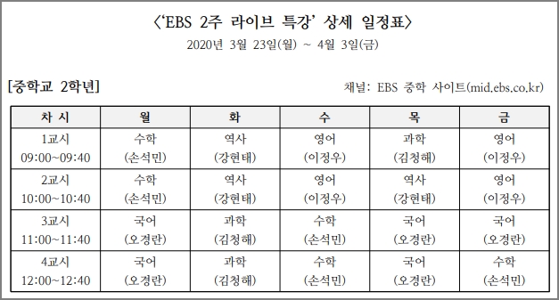 사회적 거리 두기를 위한 EBS 2주 라이브 특강입니다. 신학기 학교 진도에 맞춰 학교 시간표와 똑같이 실시간 온라인 강의를 듣기 바랍니다. 10일간 진행되는 방송입니다.