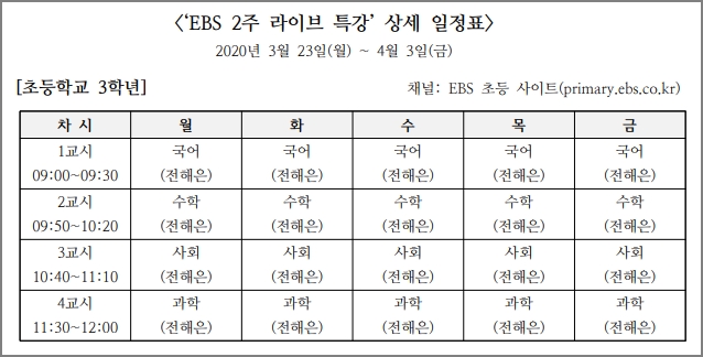 초등학교 3학년은 EBS 초등사이트에서 오전 9시부터 오전 12시까지 수업을 합니다. 1교시 부터 4교시 까지 국어, 수학, 사회, 과학을 수업합니다. 전해은 선생님이 진행합니다. <초등 사이트 바로가기>