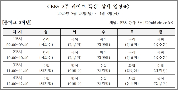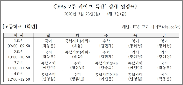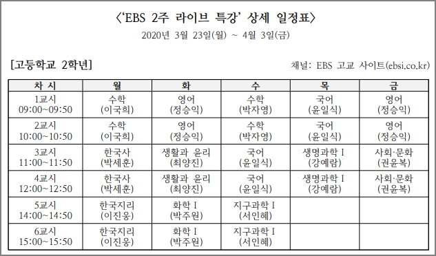 사회적 거리 두기를 위한 EBS 2주 라이브 특강입니다. 신학기 학교 진도에 맞춰 학교 시간표와 똑같이 실시간 온라인 강의를 듣기 바랍니다. 10일간 진행되는 방송입니다.