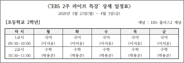 초등학교 2학년의 경우도 EBS 플러스2 채널에서 특강을 진행합니다. 아침 9시 30분부터 11시까지 수업을 합니다. 국어와 수학 수업을 2주간 온라인으로 수업을 합니다. 이서윤 선생님, 박용준 선생님이 특강을 합니다.