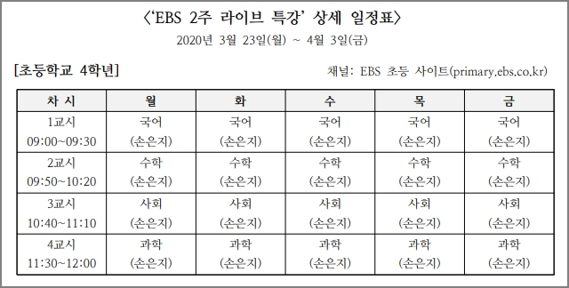초등학교 4학도 1교시부터 4교시 까지 국어, 수학, 사회, 과학을 라이브 특강을 합니다. 아침 9시부터 12시까지 입니다. 손은지 선생님이 2주가 특강을 합니다.