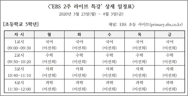 초등학교 5년도 9시부터 12시까지 수업이 있습니다. 이선희 선생님이 국어, 수학, 사회, 과학을 방송합니다.