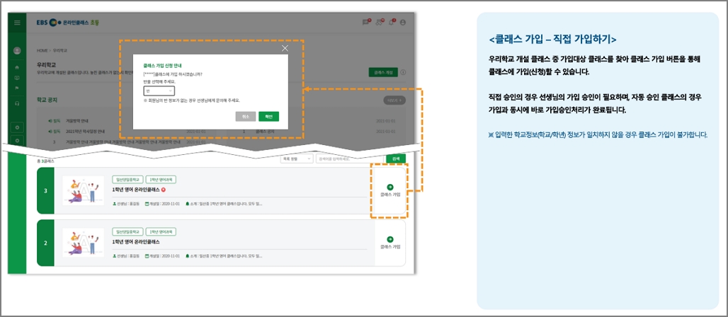 ☞ 이미 가입된 클래스 탈퇴를 원할 경우, 클래스 관리 선생님께 말씀드리면 선생님이 탈퇴 처리하실 수 있습니다. 가입 신청중(가입대기)인 클래스의 경우, [내 클래스]에서 해당 클래스에서 [신청취소]를 누르면 가입 신청이 취소됩니다.
