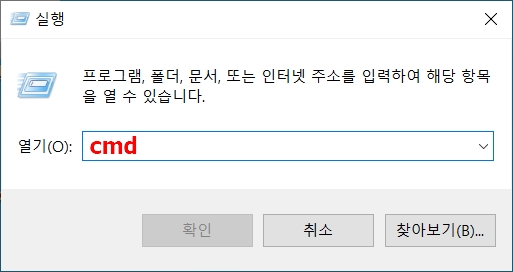 ▼ 실행 창에서 열기에 "cmd" 를 입력하고 확인 버튼을 클릭합니다.