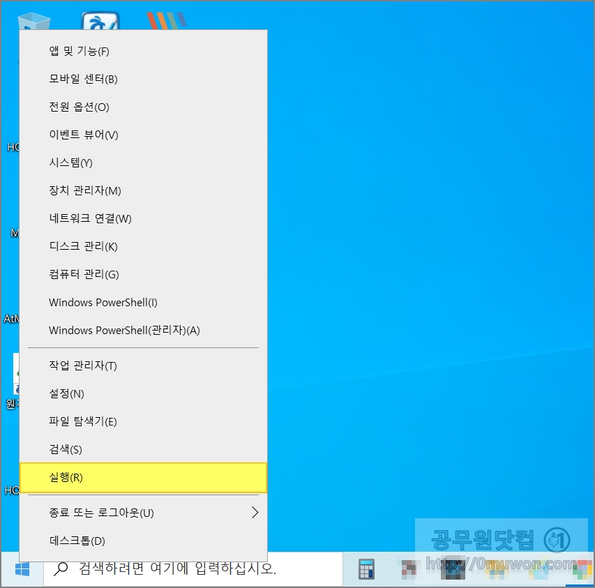 ▼ 윈도우 창 모양을 우 클릭합니다. 메뉴에서 "실행(R)" 을 클릭합니다.