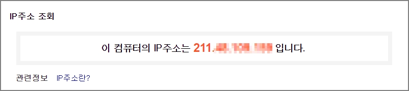 ▼ 이 컴퓨터의 IP 주소는 211.xxx.xxx.xxx 이렇게 나옵니다. 이게 공인 아이피 입니다.
