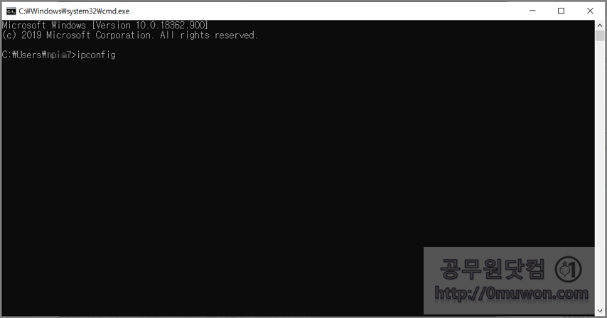 ▼ 까만색의 cmd 창이 나타납니다. 여기에서 맨 끝에 "ipconfig" 입력하고 엔터를 칩니다.