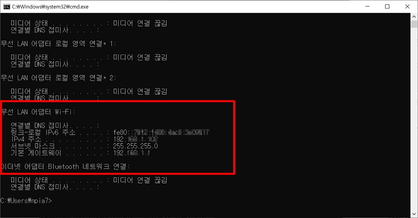 ▼ 쭈욱 아래에 글씨가 나옵니다. 화면을 내려보면 IPv4 주소 부분이 있습니다. 옆에 보이는 숫자 192.xxx.xxx.xxx 가 아이피 주소입니다. 192로 시작한다면 사설아이피 입니다. 공유기 등을 이용해서 연결하면 사설아이피가 나옵니다.