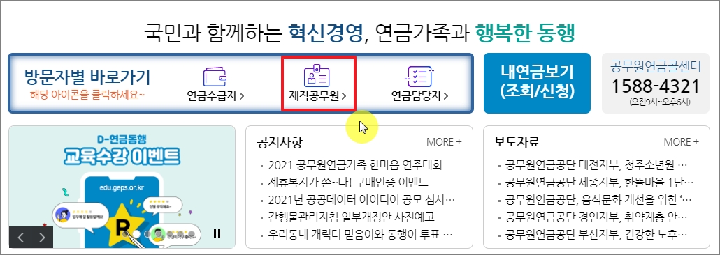 1. 공무원연금공단 홈페이지에 접속 후 재직공무원 바로가기를 클릭합니다. <▼공무원연금 공단 바로가기>