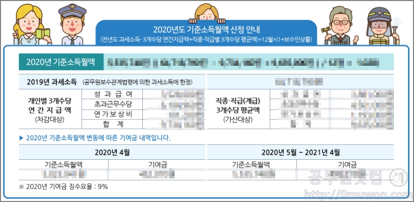 또한, 직종 직급이 같은 경우 기준소득월액이 다를 수 있습니다. 부양가족수당, 학비보조수당 등 공무원 보수 관계법령에 의해 지급받은 과세소득이 개인별로 다르기 때문에 차이가 날 수 있습니다.