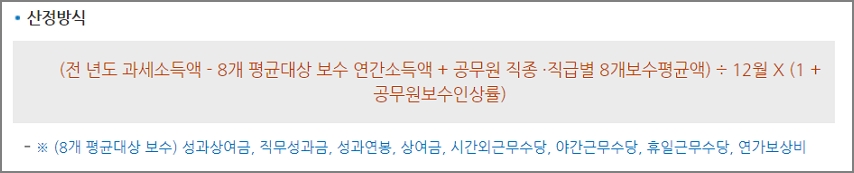 전 년도 과세소득액 - 8개 평균대상 보수 연간소득액 + 공무원 직종 ·직급별 8개보수평균액) ÷ 12월 X (1 + 공무원보수인상률