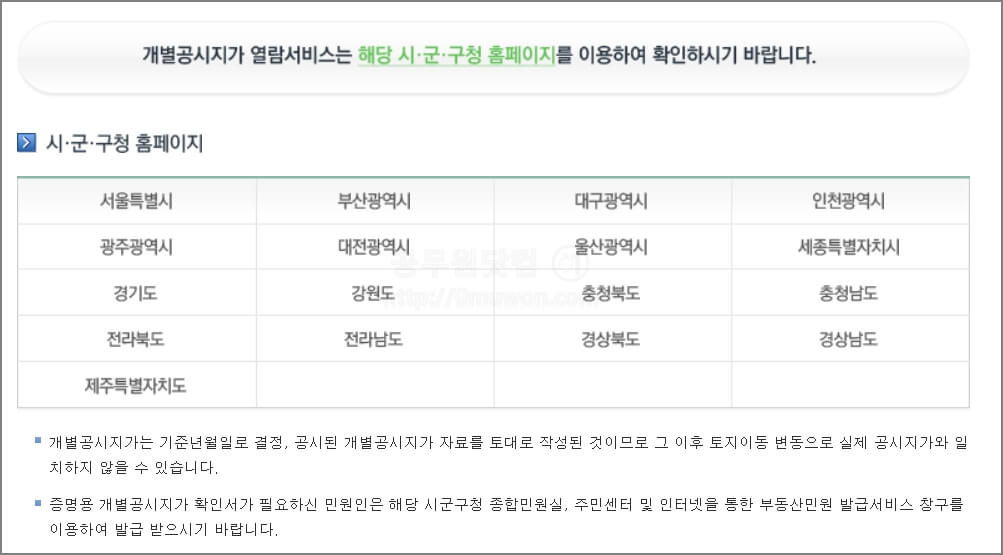 2. 개별공시지가 열람서비스를 모아놓은 주소입니다. 서울특별시, 부산광역시, 대구광역시, 인천광역시, 광주광역시, 대전광역시, 울산광역시, 세종특별자치시, 경기도, 강원도, 충청북도, 충청남도, 전라북도, 전라남도, 경상북도, 경상남도, 제추특별자치도 17개 지자체를 조회할 수 있습니다. <사이트 바로가기 >
