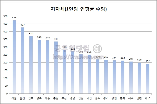 경기도, 강원도, 충청북도, 제주, 인천, 대구 등은 다른 곳에 비해 시간외근무수당 지급액이 많지는 않습니다. 지자체의 1인당 연평균 수당은 290만원정도입니다.