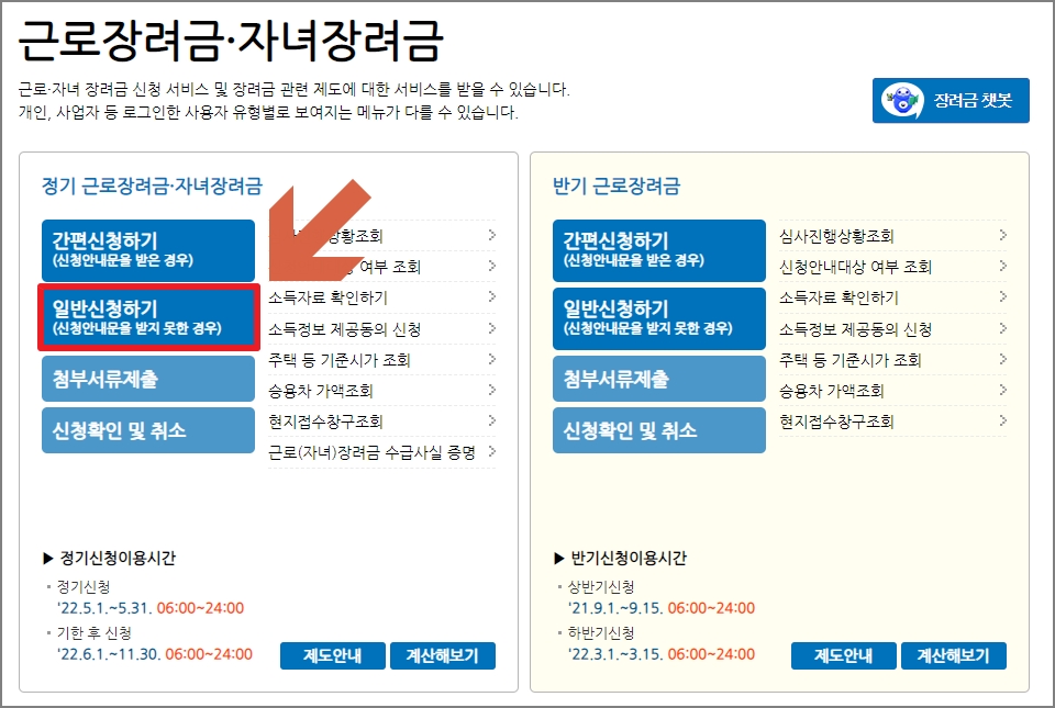 근로장려금 정기신청은 2022년 5월 1일부터 5월 31일까지 입니다. 기한 후 신청기간은 2022년 6월 1일부터 11월 30일까지입니다. 신청가능 시간은 06:00~24:00 입니다. 기한 후 신청을 한 경우 근로장려금의 10%가 감액되어 결정금액의 90%만 지급됩니다. 정기신청 기간에 신청하시기 바랍니다.