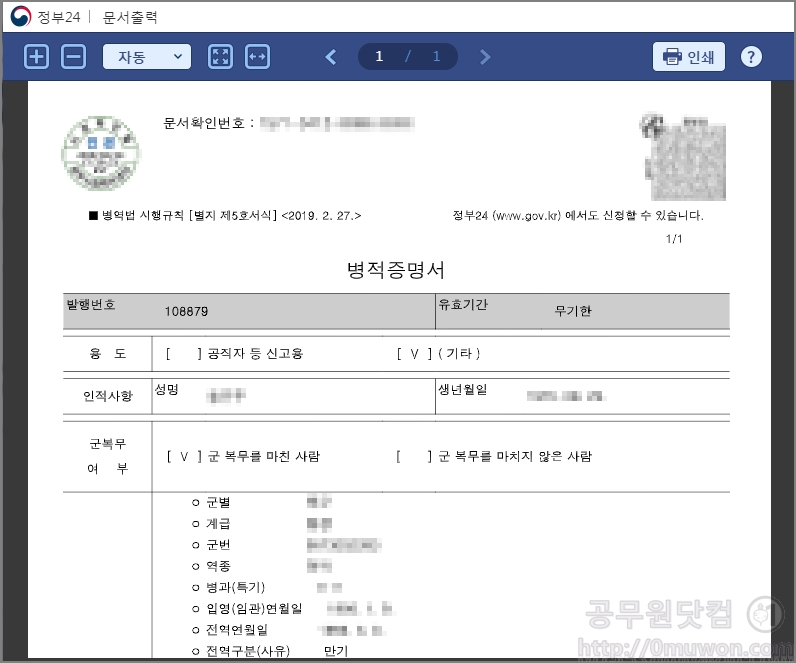 ▼ 문서출력버튼을 클릭하여 병적증명서를 출력합니다.