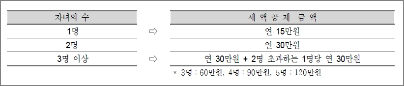 예를들어, 기본공제 받는 자녀(20세이하, 연소득 100만원 미만)가 4명인 경우 연30만원과 2명을 초과하는 셋째(30만원), 넷째(30만원)으로 총 90만원 세액공제가 됩니다. 5명은 120만원 공제입니다.