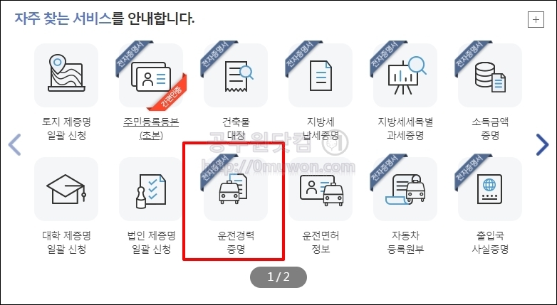 2. 운전경력증명을 클릭합니다. 자주 찾는 서비스에는 정부24에서 많이 사용을 하고 있는 대표적인 메뉴를 쉽게 찾을 수 있도록 해놨습니다. 국문 운전경력증명서 발급과 동일합니다. ▼ 운전경력증명서 무료 발급 방법 (인터넷, 경찰서)