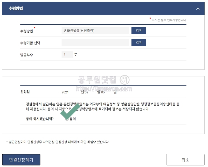 4. 성명, 생년월일, 발급기간, 수령방법, 발급부수 등을 입력합니다. 영문 운전경력증명서의 경우는 추가로 정보제공 동의를 하여야 합니다. 경찰청에서 발급하는 영문 운전경력증명서는 외교부의 여권 정보 중 영문성명만을 행정정보공동이용센터를 통해 제공이 된다고 하네요. 동의에 체크를 합니다.