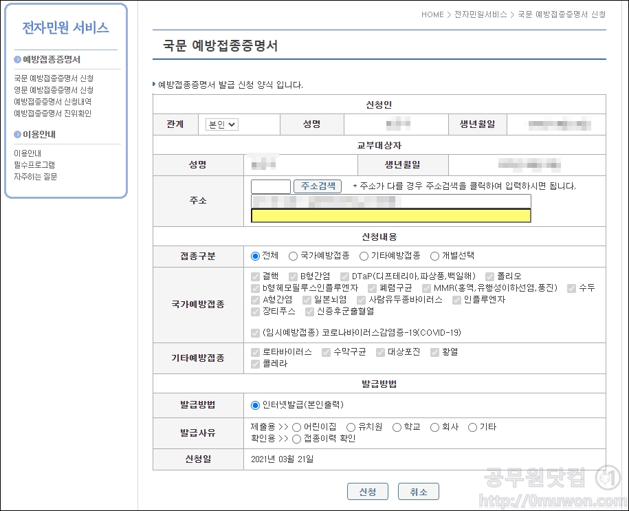 6. 예방접종증명서 발급 신청서를 작성합니다. 주소, 발급사유 등을 입력합니다.