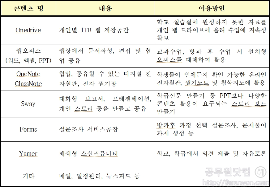 가정, 학교 등 인터넷이 되는 모든 기기 장소에서 사용이 가능합니다. 수업 연속성 확보를 위해 학생실습실등에 오피스 설치 없이 접속 이용, 동호회 활동에 정보공유 및 협업, 웹 검색엔진 노출없는 의견 교환 등에 사용하시면 됩니다. 오늘은 오피스 365 무료로 이용하는 법을 알아보도록 하겠습니다.