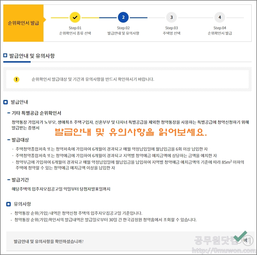 ▼ 순위확인서 발급대상 및 기간과 유의사항을 읽어보시기 바랍니다. 확인을 하였다면 "예" 체크를 합니다. 발급은 보통 가입한지 6개월이 경과되고, 월납입금을 6회 이상 납입해야 발급이 가능합니다.
