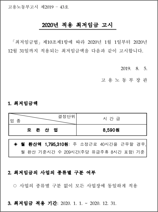 1. 2020년 적용 최저임금 고시